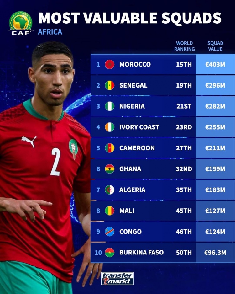 德国转会市场网最新更新了非洲足联各国家队的身价排名,显示了非洲足球强队的崛起与发展。其中,摩洛哥国家队以总身价4.03亿欧元稳居榜首,展现出其在国际舞台的实力和潜力。摩洛哥在2022年世界杯上表现出色,跻身四强,何其令人振奋,无疑让整个非洲沸腾。